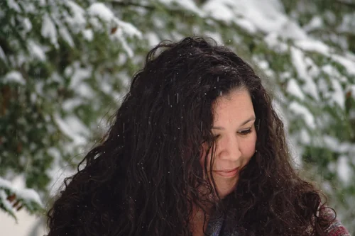 A beautiful woman in the snow, smiling discretely.