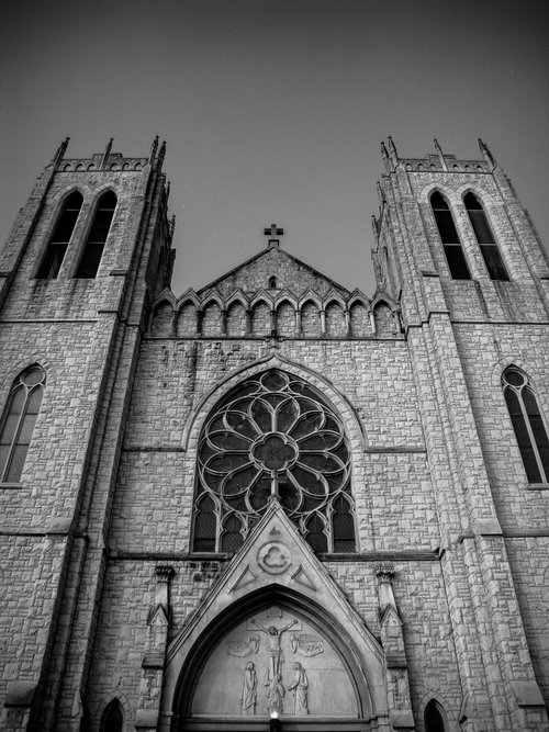 The front of the Cathedral style church for Mary, Mother of Hope church in New Castle, PA.